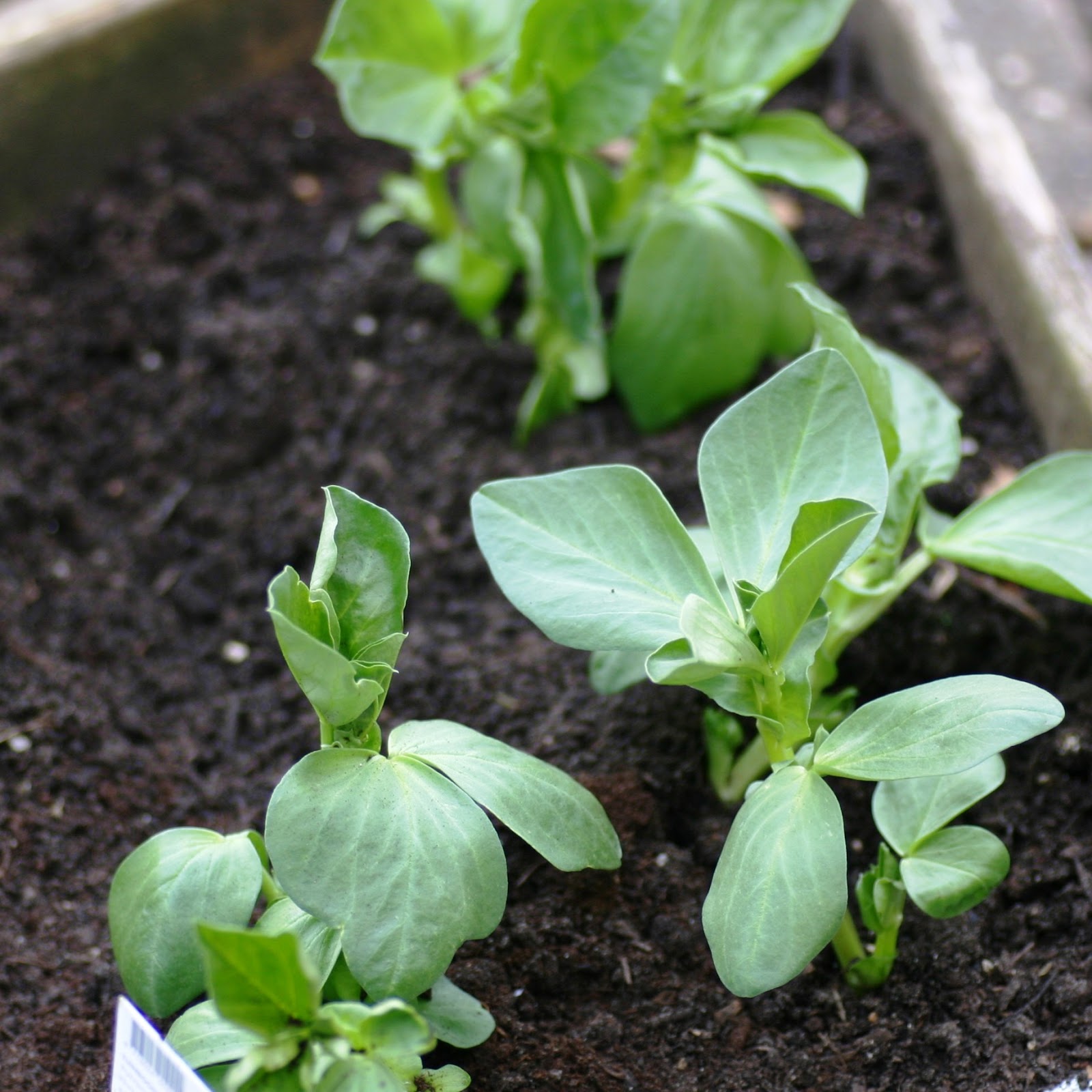De broccoli en de Chinese kool hadden inmiddels ook hun eigen blaadjes gekregen, naast de kiembladeren. Deze zijn nog te klein om direct in de bak te plaatsen dus die heb ik verspeend. Ze hebben nu een groter potje, zodat ze zich beter ontwikkelen en later in de bak gaan. Ze staan in een soort van koude bak; een viskist van piepschuim en plexiglas er boven. Ik had geen tuinbonen bemachtigd om te zaaien, dus toen ik deze zaterdag tegen kwam bij de kweker heb ik de plantjes gekocht. Ze zijn al mooi groot en dus kregen ze gelijk een plaatsje in de bak. Scheelt weer zaaien.