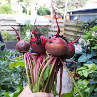 Elk jaar heb ik ook bietjes in de tuin. Dit jaar 2 soorten: rode ronde kogel en de Chioggia biet. Dit is een mooie biet die je ook rauw, als je hem in dunne plakjes snijdt, kunt eten. Bij het schoonmaken, zag ik dat ik alleen maar deze soort had geoogst. Andere jaren had ik deze ook gekookt en dan vond ik hem niet zo lekker. Daarnaast is de kleur na het koken ook niet meer zo mooi. Ik heb dan ook besloten om de bietjes heel kort te koken. Het resultaat was een heerlijke biet, die ik een salade met appel, walnoot en kaas heb verwerkt. Ook hier staan nog wat kleinere bietjes in de bak, die nu wat meer ruimte hebben om verder te groeien.