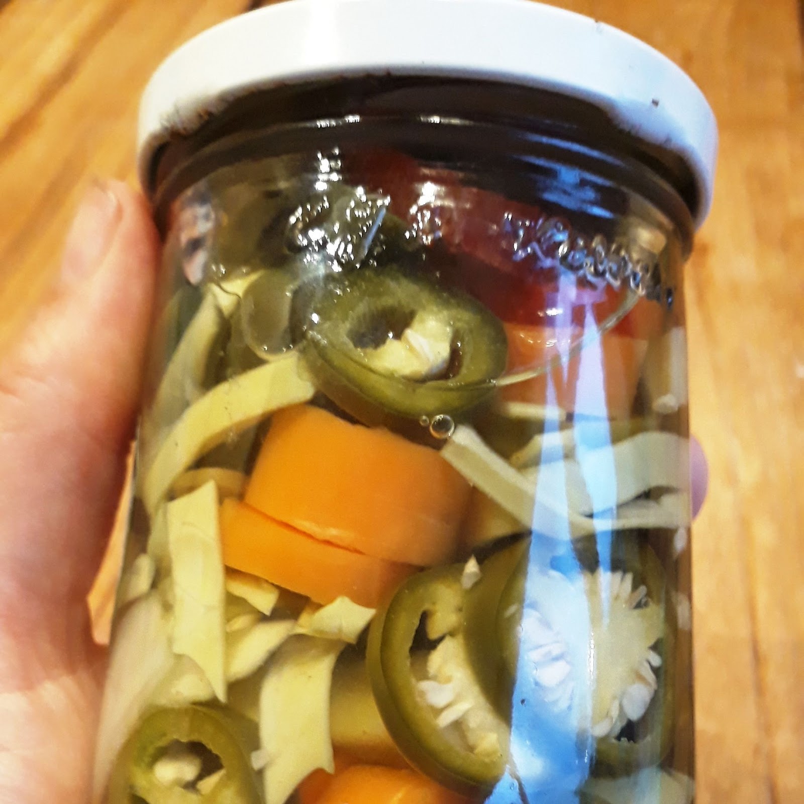 Jalapeño pepers, maar ook heel veel andere soorten pepers lenen zich er erg goed voor om in te maken. Ik heb de Peperocini en de Jalapeño gebruikt. Beide pepers heb ik zowel rood als groen geoogst. Dat geeft ook een mooie kleurcombinatie in de potten. Je snijdt de pepers in ringetjes. Dit heb ik gemengd met wat andere groente zoals reepjes kool, ui en wortel. Je kunt hiervoor ook heel goed bloemkool roosjes gebruiken. Ik heb de potjes gevuld met de mengsels. In een pan heb ik 2/3 azijn met 1/3 water gemengd met inmaakkruiden uit Hongarije samen met wat suiker en zout. De kruiden bestaan ook mosterd- en korianderzaden met wat laurier. Dit heb ik ik laten koken. Dan vul ik de potjes met dit mengsel. Goed afsluiten en op de kop laten afkoelen.