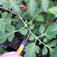 Mijn tomaten staan gelukkig in mijn afdak XL, want al dat water hadden ze niet leuk gevonden en met deze temperaturen loert de schimmelziekte ook. Om dit te voorkomen in de kas, moet je je tomaten snoeien. Tenminste dat doe ik, omdat ze bij mij vrij dicht op elkaar staan en er zo geen ventilatie is. Ventilatie zorgt dat de schimmel dan minder kans krijgt, omdat het eventuele water snel kan opdrogen. Ik knip ongeveer 1/3 van het blad af. Ook de bladeren van planten die elkaar kruizen, krijgen een snoeibeurt. Daarnaast dief ik de stamtomaten en dat zijn bij mij bijna alle soorten. In de oksel van de plant groeit vaak een nieuwe ‘tak’. Deze kun je er gemakkelijk uitbreken. Omdat ik bijna alleen stamtomaten heb, ondersteun ik de tomaten met een tomatenspiraal, maar het kan ook met bamboestokken of touwtjes vanaf boven als je een kas hebt.