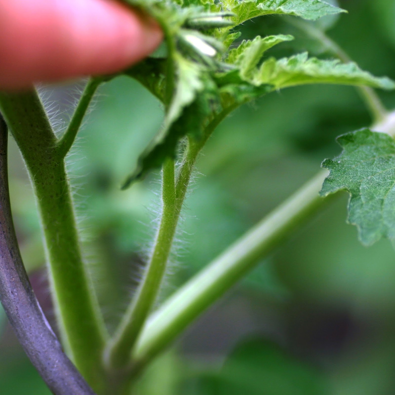 Om de tomaten een beetje in toom te houden snoei ik de tomaten. Ik haal de dieven weg. Dieven zijn nieuwe groeistengels in de oksel van de bladeren. Ze nemen veel energie weg en daarom heten ze dieven. Als je ze laat zitten, worden het grote bossige tomatenplanten. De ventilatie tussen de bladeren is dan minder, waardoor de kans ook groter is op de schimmelziekte. Dit is ook de reden dat ik ongeveer 1/3 van de bladeren weg knip. Mijn planten staan dicht op elkaar en zo zorg ik ook voor ventilatie. Als er eenmaal tomaten aan zitten haal ik het blad rondom weg, zodat de zon goed op de tomaten kan schijnen en de tomaten zoet maakt. De onderste bladeren gaan ook helemaal weg.