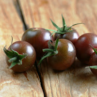 2 nieuwe soorten die mij ook heel goed zijn bevallen zijn de Sunrise Bumble Bee en de Purple Cherry. Beide zijn er opvallend mooi uit. De Sunrise Bumble Bee is oranje met rode streepjes. Ook weer een heerlijk zoet tomaatje. Het is een vroege soort dus waarschijnlijk hebben mijn buren en mijn zusje hier volop van gegeten. Er hangt nu bijna niets meer aan. De andere blijver is de Purple Cherry. Ook weer prachtig om te zien en wat een opbrengst. Een paars tomaat met kopergroene streepjes.