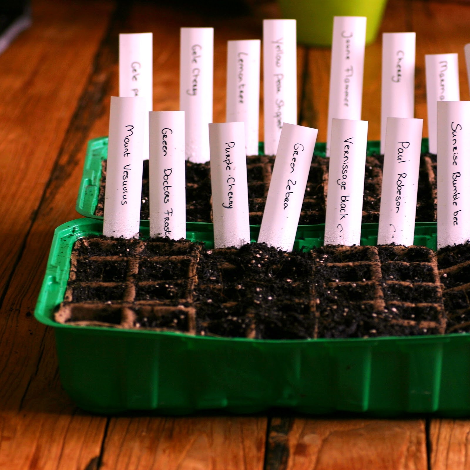 Er zijn allerlei zaaigereedschappen te koop, die je het ook weer wat gemakkelijker kunnen maken. Zo zijn er zaaidoosjes of zaairoller waarbij de zaden er gelijkmatig uit komen. Een zaaistok is ook handig, daar maak je gaatjes mee in de aarde. Ik heb eentje met centimeters aangegeven, zo kun je zien hoe diep je een gaatje maakt. Verder is het handig om een schepje te hebben en bij het verpotten gewoon een lepel of een vork. En vergeet ook niet een van de belangrijkste hulpmiddelen bij binnen zaaien: een plantenspuit